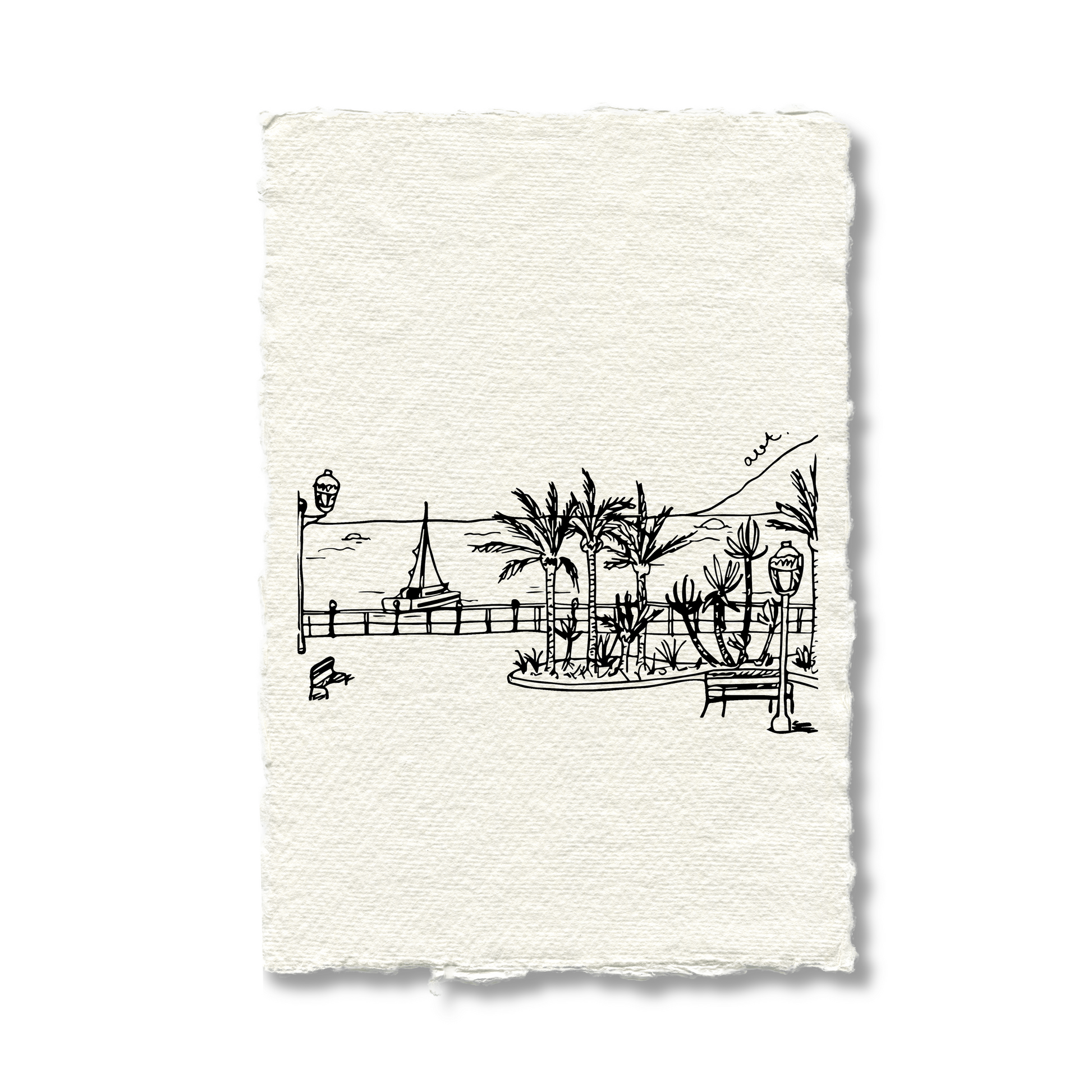 Ibiza | Santa Eularia (LIMITED) is a refined fine line print that brings to life the peaceful elegance of Santa Eularia’s promenade. This minimalist black-and-white illustration captures palm trees, a seaside bench, and the relaxed energy of Ibiza’s charming waterfront.